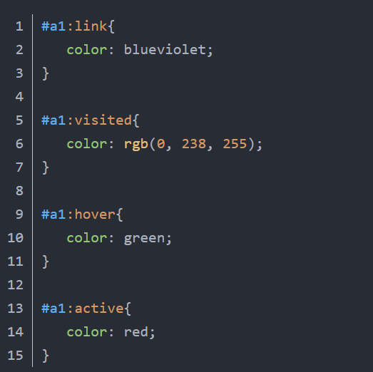 通常用于对链接的不同状态以添加样式效果,他可以帮助我们根据链接的状态(访问前,访问后,鼠标悬停在链接上,链接被点击时但鼠标未松开)定义不同的样式