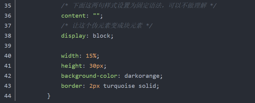 在定义伪元素时,必须定义content属性; ,伪元素本身是行内元素,如果要定义为其配置宽高则需要定义display属性为 block;(转为块级元素)或者line-bolck(行内块元素)